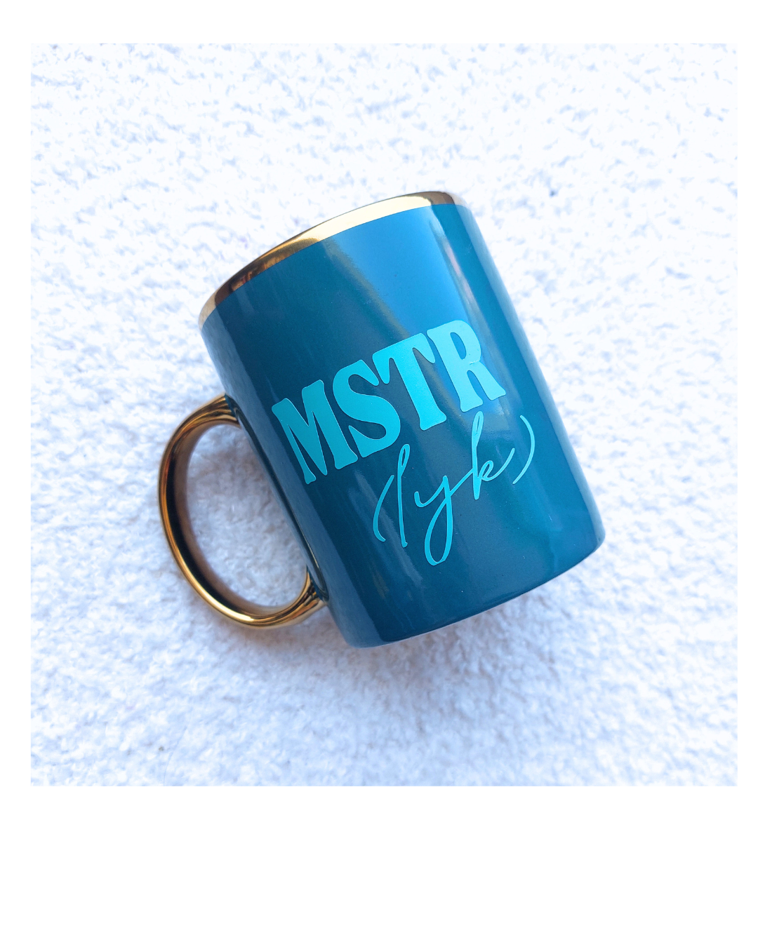 Een lekkere grote mok voor de juf of meester, met een mooie gouden rand en handvat.