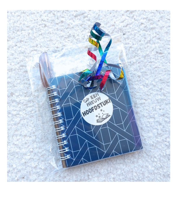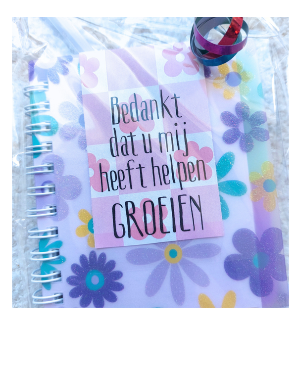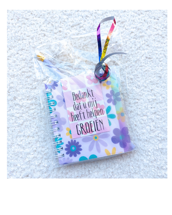Een makkelijk notitieboekje met sticker of label voor de juf of meester.