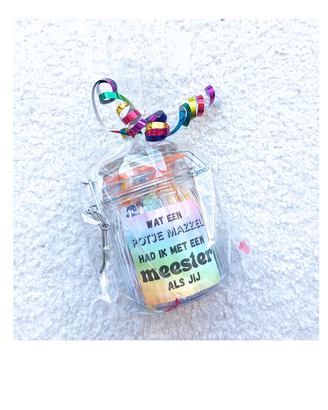 Een glazen potje gevuld met snoepjes en een leuke tekst.