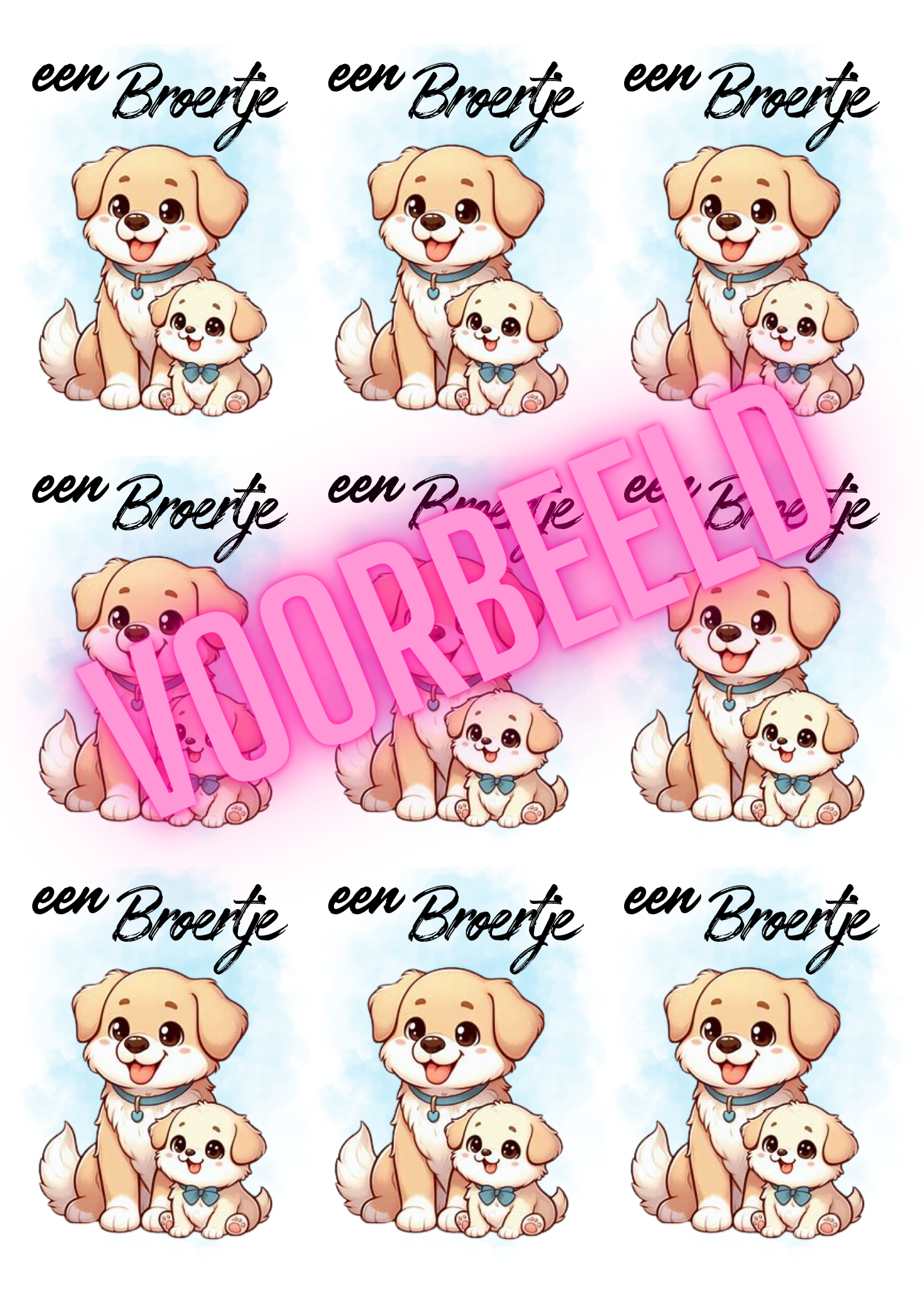 Dit lieve label met hondjes past perfect bij een leuke traktatie voor de geboorte van een klein broertje.