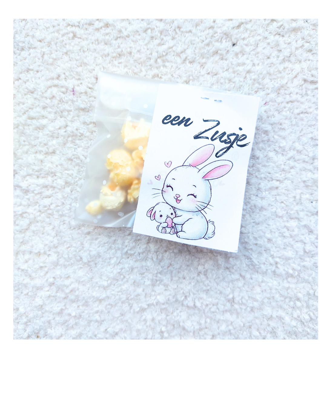 Dit lieve label met leuke konijntjes past perfect bij een leuke traktatie voor de geboorte van een klein zusje.