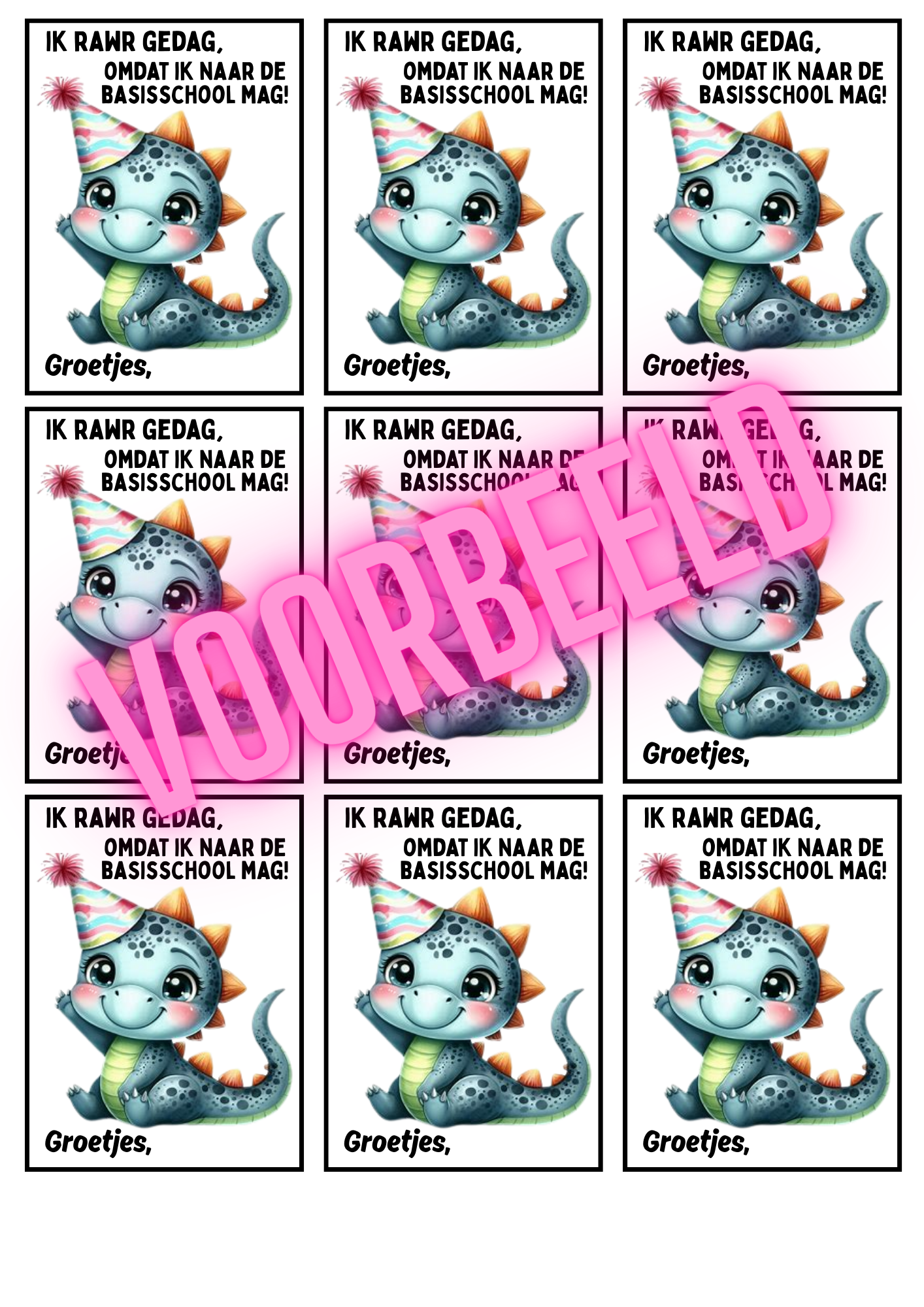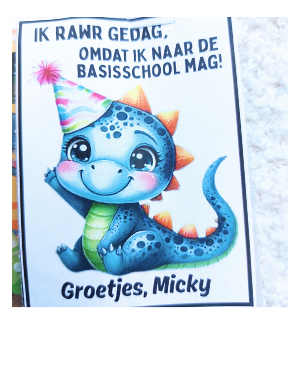 Dit lieve label met een leuke dino past perfect bij een leuke traktatie voordat jouw kleintje naar de basisschool gaat.