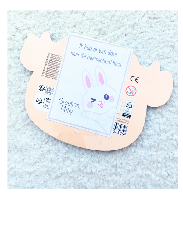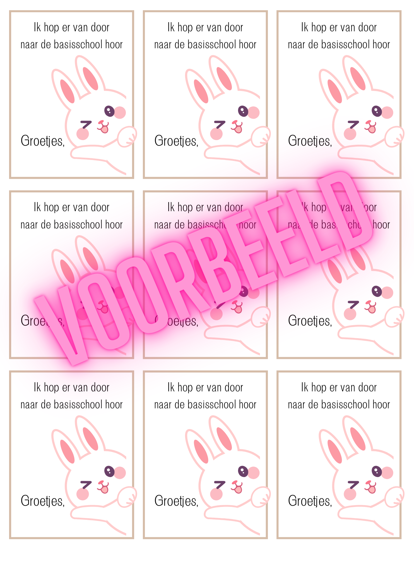 Dit lieve label met een lief konijntje past perfect bij een leuke traktatie voordat jouw kleintje naar de basisschool gaat.