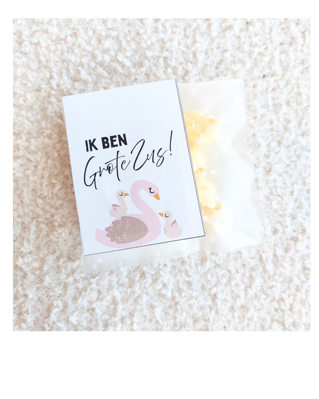 Dit lieve label met zwaantjes past perfect bij een leuke traktatie voor de geboorte van 2 kleine zusjes.