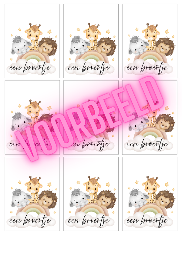 Dit lieve label met jungle diertjes past perfect bij een leuke traktatie voor de geboorte van een klein broertje.